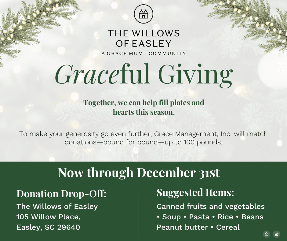 To make your generosity go even further, Grace Management, Inc. will match donations—pound for pound—up to 100 lbs! We can help fill plates and hearts this season through Graceful Giving.